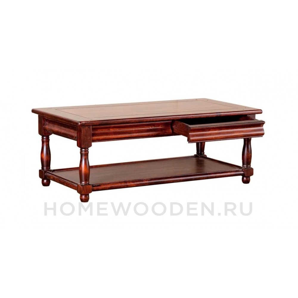У стола журнального ОВ 13.01 прямоугольная столешница с фрезеровкой по периметру, под столешницей расположены два выдвижных ящика и внизу полочка для газет и журналов. Столешницы с плавными углами. Ножки точеные